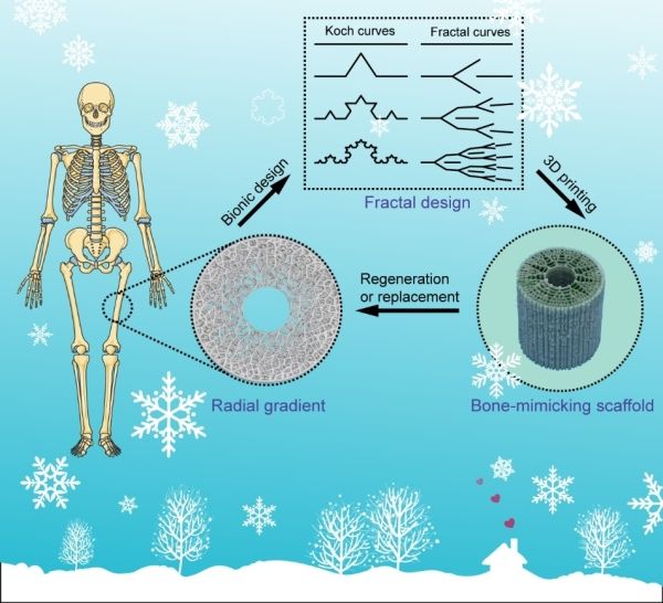 该研究受分形理论的启发,基于科赫雪花的迭代规则设计、定义了分形支架的分形曲线的单元线条,将分形单元线条进行圆周阵列得到分形层,并设计圆环层使其在挤出式3D打印堆积成型的过程中与分形层相互支撑。为参数化构建径向梯度骨组织工程支架,该研究还搭建了“设计—分析—制造”的工作流。研究表明,所构建的仿生径向梯度支架在孔隙结构、渗透性能、机械性能等方面展现优异的梯度特征。