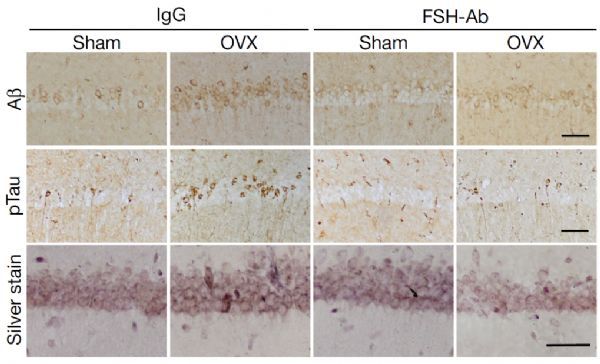 以上结果均表明,确是由于女性围绝经期体内FSH急剧升高(和男性有显着差异),与受体(FSHR)结合后激活特定通路CEBPβ/AEP,从而导致女性易感AD。